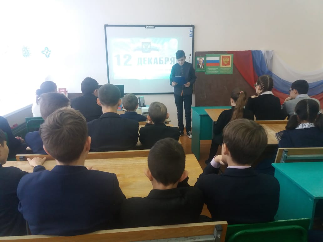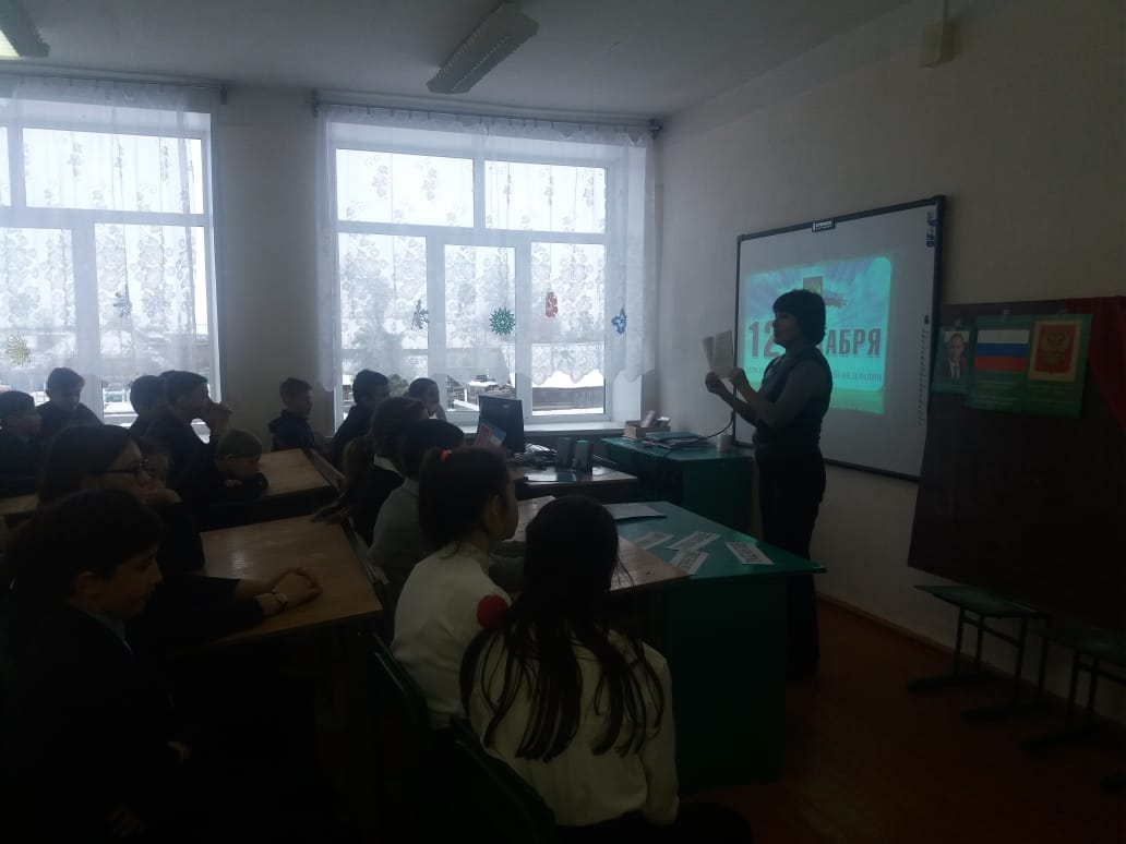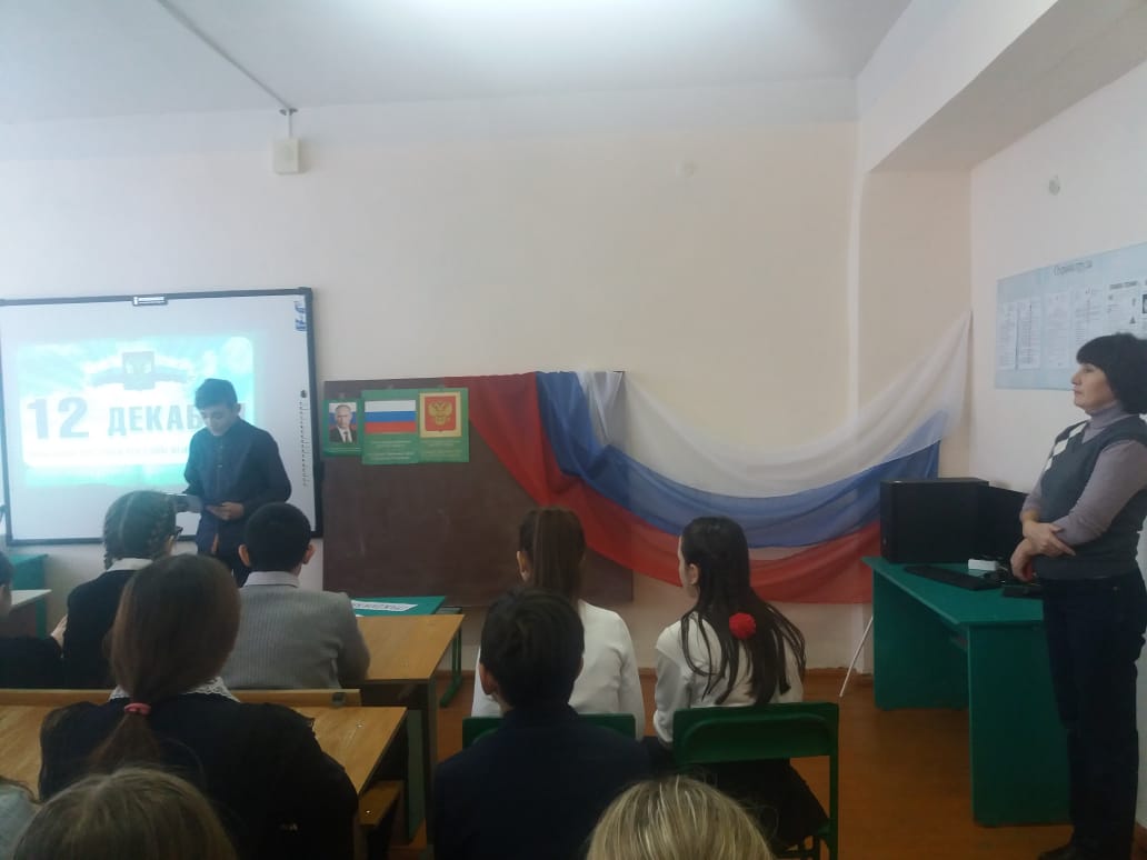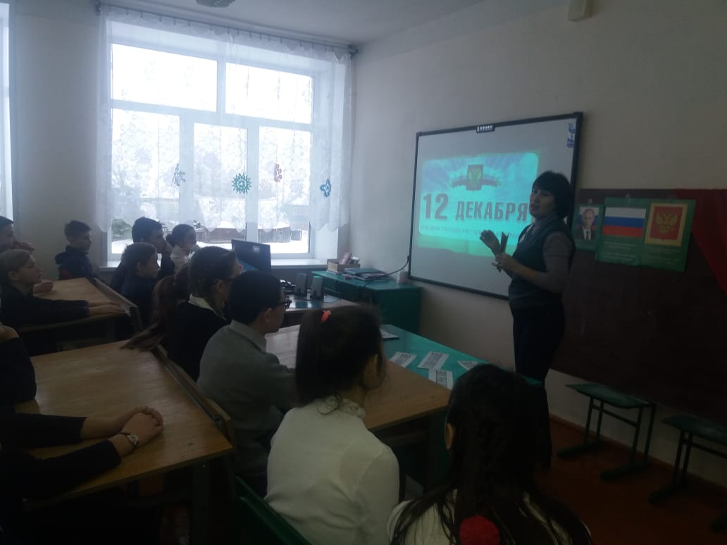 Наша школа не стала исключением. В 6-9 классах с целью формирования у учащихся представления о Конституции РФ, символике России, чувства патриотизма, гражданского сознания и гордости за свою страну учитель обществознания Хузина Г.Д. провела внеклассное мероприятие «Мы граждане великой России!». В начале мероприятия прозвучало стихотворение о нашей великой Родине, после чего учитель кратко напомнила ребятам о том, что такое Конституция РФ, когда она была принята, что провозглашает. Далее дети рассказали о символах государства (Гимне, Флаге и Гербе), прослушали запись государственного Гимна РФ, поговорили о президенте России, территории РФ, посмотрели слайды, отражающие красоту нашей Родины. В завершение мероприятия провели небольшую викторину «Кто лучше всех знает Россию?».
